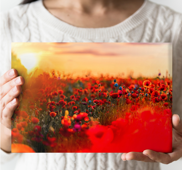 Den här landskapsduken i gyllene timmen med röda blommor kan anpassas i storlek och mängdencanvas tavla som visar designen.