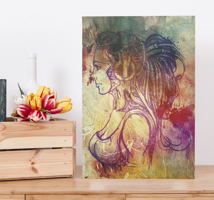 Referens: Q6417En fängslande profilsilhuett av en kvinna med flödande hår, intrikat illustrerad mot en texturerad bakgrund. Designen fångar essensen av femininitet samtidigt som den visar detaljerat linjearbete och livfulla färgklickar, vilket skapar en harmonisk blandning av konst och uttryck.