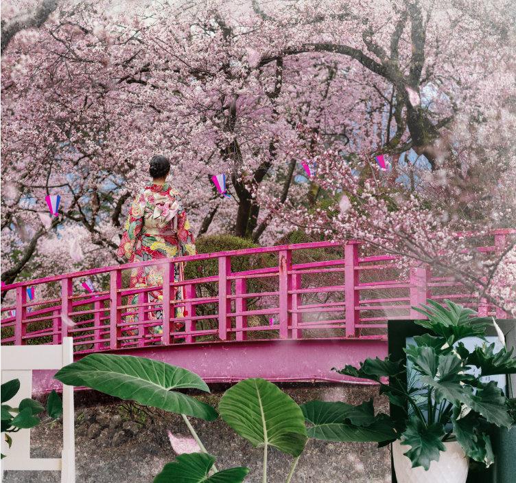 Referens: F12031En lugn skildring av körsbärsblommor i full blom, som ramar in en traditionell figur på en rosa bro. De ömtåliga rosa blommorna skapar en fridfull atmosfär, förstärkt av de färgglada dekorationerna runt omkring, som förkroppsligar naturens och kulturens skönhet.