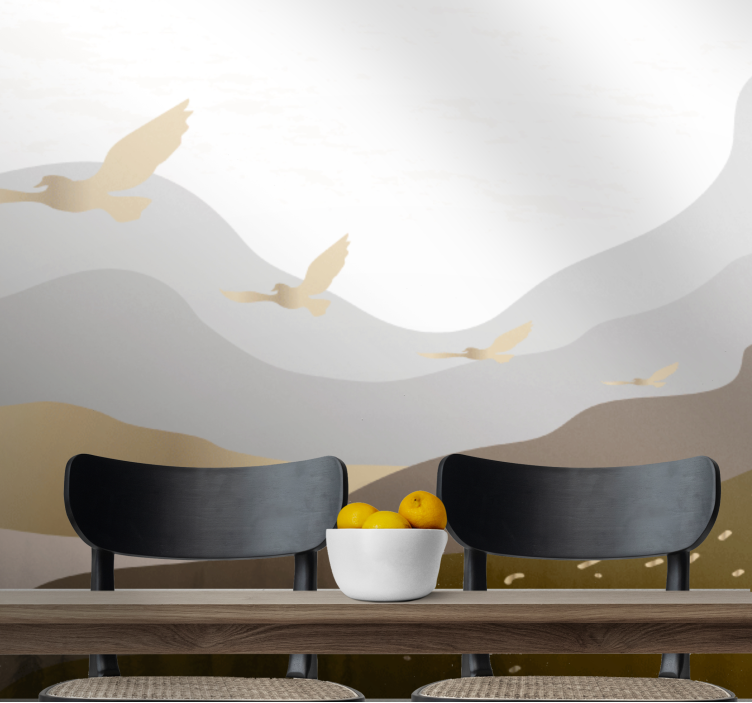 Upplev den fantastiska designen av våra fototapeter natur flygande fågel silhuetter, där eleganta fåglar sväva över majestätiska berg i en stilren silhuett. Den gyllene illustrationen av naturen ger liv och karaktär till ditt rum, och skapar en harmonisk atmosfär som inspirerar till lugn och reflektion.