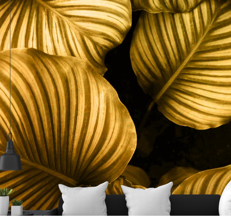 Upplev den fantastiska skönheten av Fototapeter Övriga blommor guldiga löv mönster som för in en tropisk och naturlig känsla i ditt hem! Denna design, med sina gyllene och texturerade blad och löv, skapar en harmonisk atmosfär som förför ögat. Perfekt för varje rum, ger den liv och elegans med sin unika stil!