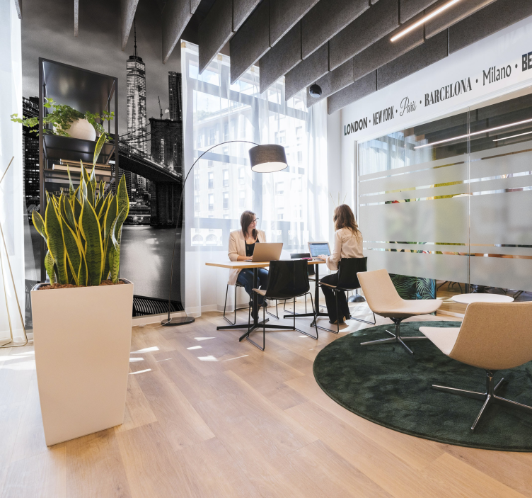 Referens: F12189Ett modernt kontorsutrymme visar två individer som deltar i ett möte, med en slående stadssilhuett-målning som framhäver ikoniska landmärken. En livfull växt ger en touch av natur, vilket förbättrar den interaktiva miljön. Designen betonar en blandning av stadsliv och professionellt samarbete.