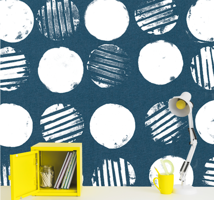 Upptäck den unika och stilrena designen av våra Fototapeter textur och mönster cirkulärt mönster. Denna fototapet är en fantastisk kombination av cirklar, frimärken och stämplar i en minimalistisk stil. Med ett randigt och abstrakt mönster i lugna blå nyanser skapar den en harmonisk atmosfär i ditt hem. Perfekt för att ge liv åt väggar och skapa en modern känsla!