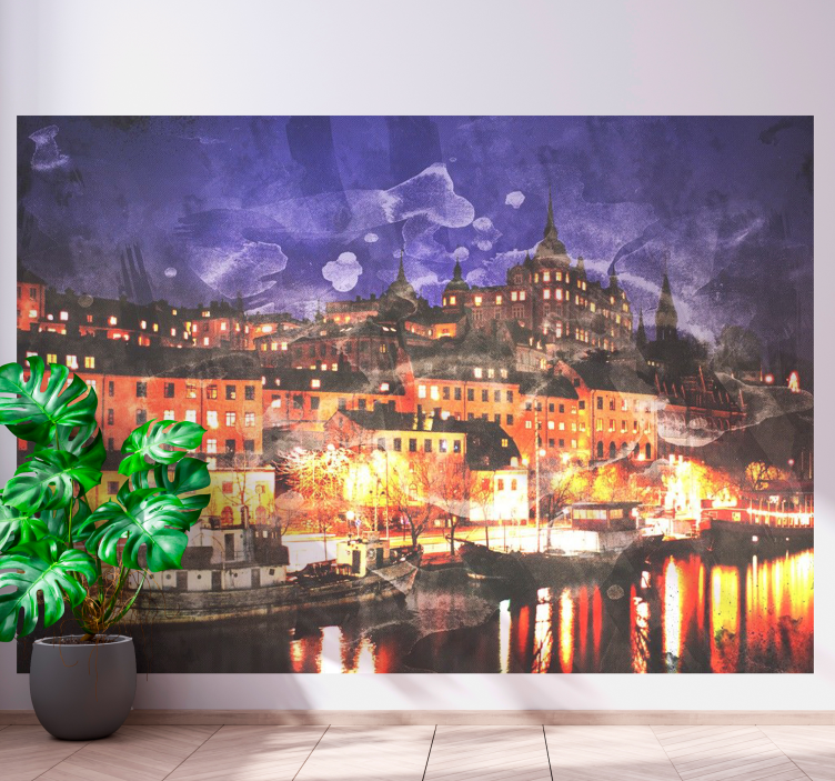 Referens: F8201En fängslande vy av en stad på natten, som visar upp upplysta byggnader speglade i vattnet. Den fantasifulla arkitekturen har förtrollande ljus som skapar en magisk atmosfär. Denna design transporterar betraktaren till en livlig stadsmiljö, perfekt för att lägga till en touch av stadens charm i vilket utrymme som helst.