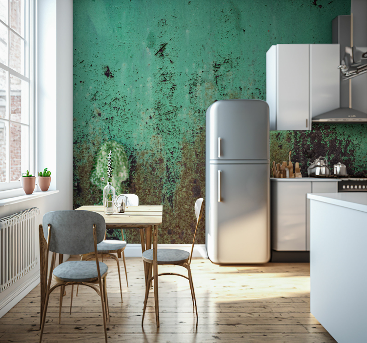 Den rostiga grön vägg fototapeten i övriga texturer och mönster erbjuder en unik och inspirerande design som ger ett industriellt och rostigt utseende. Denna fototapet ger en touch av gammal världskarisma till ditt utrymme med dess unika mönster och texturer.Hur man använder den här produkten