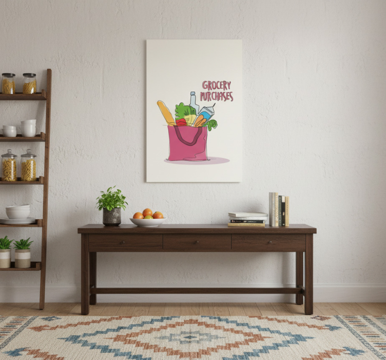 Placera din Grocery illustration poster kök på en synlig plats i ditt kök för maximal effekt! Använd köksposter som en del av din väggdekoration, antingen ensam eller i kombination med andra konstverk. För bästa resultat, fäst den med dubbelhäftande tejp eller rama in den för en elegant look. Kom ihåg att trycka fast remsorna i 10 sekunder för att säkerställa att den sitter ordentligt!