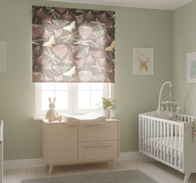 Rullgardin barn rosa blad svart fjärilsmönster