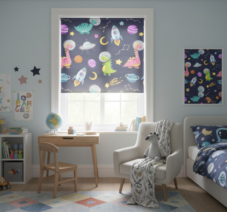 Rullgardin barn sött design rymd dinosaurer