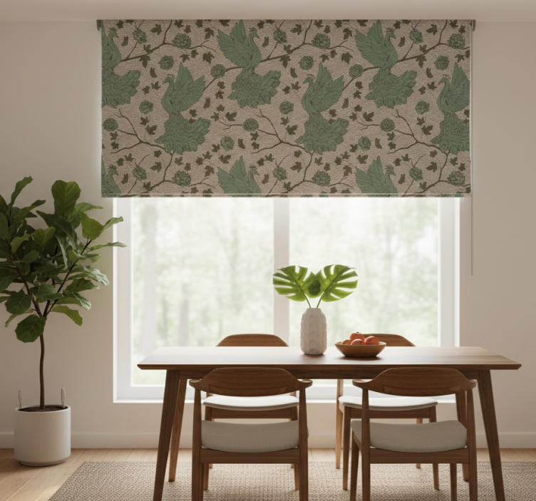 Rullgardin för matsal gröna fåglar på jute bakgrund