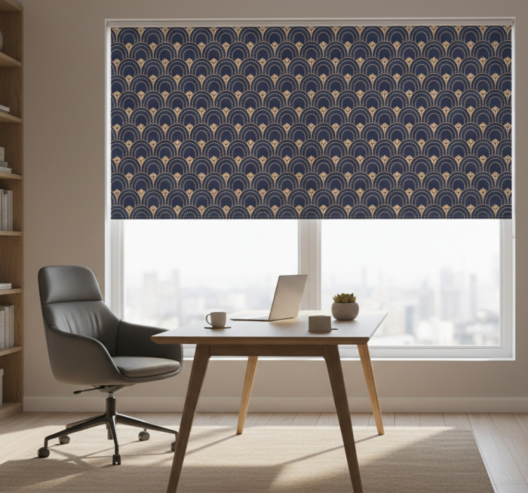 Rullgardin hemmakkontor med utsmykket vifte mønster Rullgardin hemmakkontor är inte bara en praktisk lösning, utan också en fantastisk dekoration för ditt arbetsutrymme. Med sitt unika mönster tillför det en personlig touch och gör ditt kontor mer inbjudande. Denna rullgardin är 100 % anpassningsbar i mått och finns i tre olika texturer, vilket innebär att du kan välja den som bäst passar dina behov av ljusinsläpp och avskildhet. Låt denna rullgardin bli en del av din inredning och skapa en harmonisk atmosfär där du kan fokusera och arbeta effektivt!