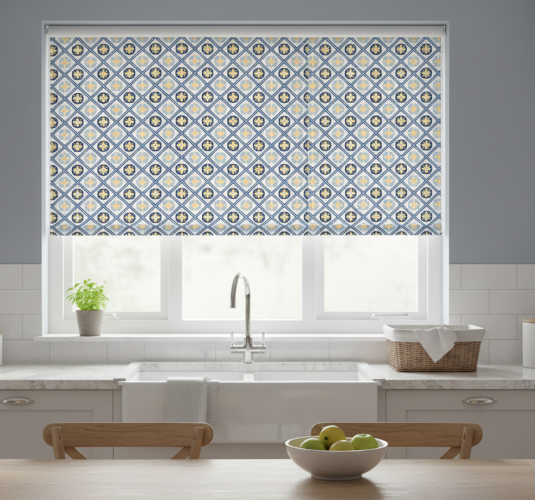 Rullgardin kök babyblå och gula portugisiska plattor
