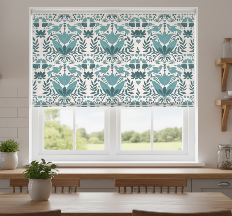 Rullgardin kök blått folkartmönster med fåglar
