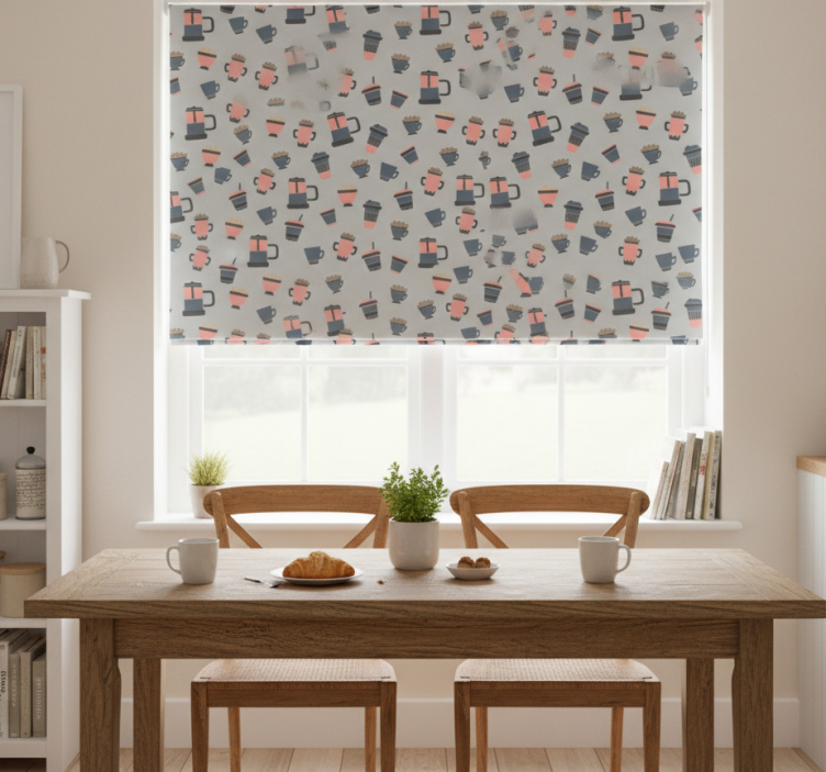 Referens: E6450Vår Rullgardin kök kaffe takeaway mönster är en perfekt kombination av stil och funktionalitet. Med sitt unika mönster av kaffekoppar och takeaway-muggar, ger den en livlig och inbjudande atmosfär i ditt kök. Designen är både modern och tidlös, vilket gör att den passar in i olika inredningsstilar. Den är lätt att rengöra och kan enkelt demonteras med två klick, vilket gör att du snabbt kan hålla ditt fönster och dess omgivning fräscha. Dessutom skyddar den ditt rum från direkt solljus och ger dig den integritet du behöver när den är sänkt. Med denna rullgardin kan du även reglera rumstemperaturen, vilket gör den både praktisk och funktionell!