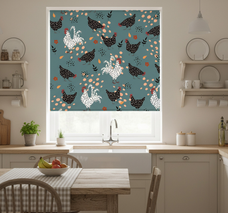 Rullgardin kök med svarta och vita höns och blommor