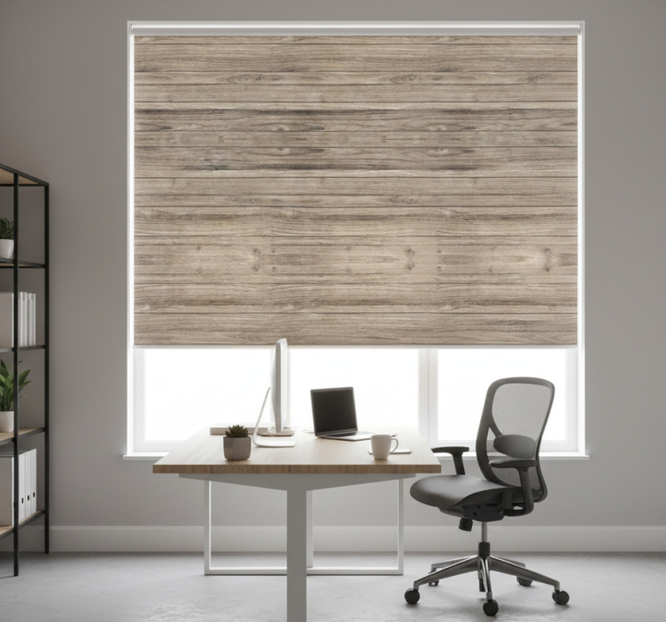 Rullgardin kontor grå rustika horisontella träplankor