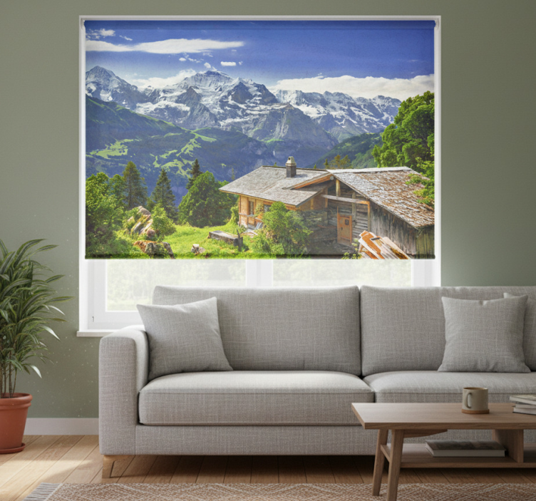 Rullgardin vardagsrum grindelwald snöberg och grön äng