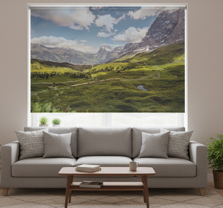 Rullgardin vardagsrum grön äng med berg och tåg