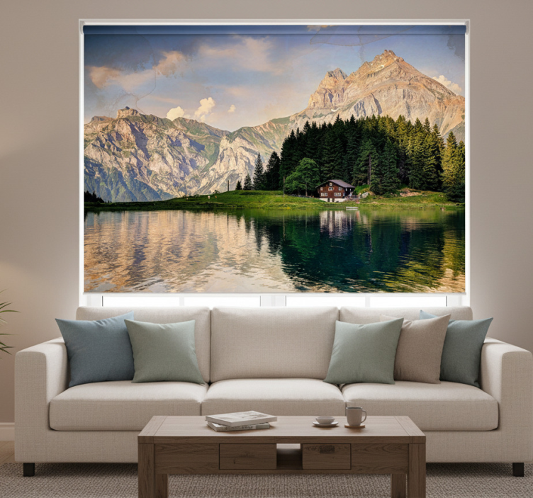 En Rullgardin vardagsrum hus vid sjön med bergen i bakgrunden är den perfekta lösningen för att piffa upp din inredning! Den erbjuder en harmonisk balans mellan stil och funktionalitet, vilket skapar en lugn atmosfär i ditt hem. Genom att välja en rullgardin i en textur som passar din stil, kan du enkelt förbättra inredningen och skapa en mysig känsla. Denna rullgardin är inte bara en praktisk lösning för att blockera ljus, utan även en vacker detalj som gör ditt vardagsrum mer inbjudande!