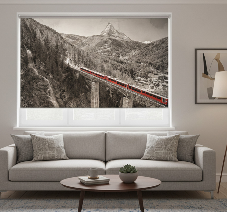 En Rullgardin vardagsrum röd tåg på bro med matterhorn Rullgardin vardagsrum är den perfekta lösningen för att ge ditt hem en personlig touch. Med sin livfulla design och praktiska funktioner, såsom att skydda mot direkt solljus och förbättra inredningen av rummet, är denna rullgardin ett inspirerande val för alla som vill skapa en mysig och stilren miljö. Dessutom är den 100 % anpassningsbar, vilket gör den idealisk för alla typer av fönster. Låt denna unika rullgardin bli en del av din inredning och upplev hur den förvandlar ditt vardagsrum till en oas av stil och komfort!