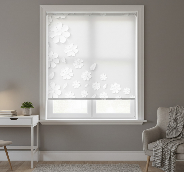 Vit rullgardin med bakgrund av vita blommor