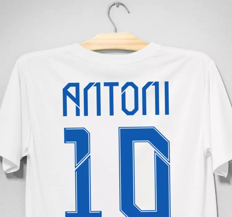 Referens: T4762Denna design visar ett personligt namn och nummer i en slående stil. Den djärva typografin framhäver namnet 'Antoni' tillsammans med numret '10', vilket skapar ett dynamiskt och iögonfallande utseende som passar sportentusiaster.