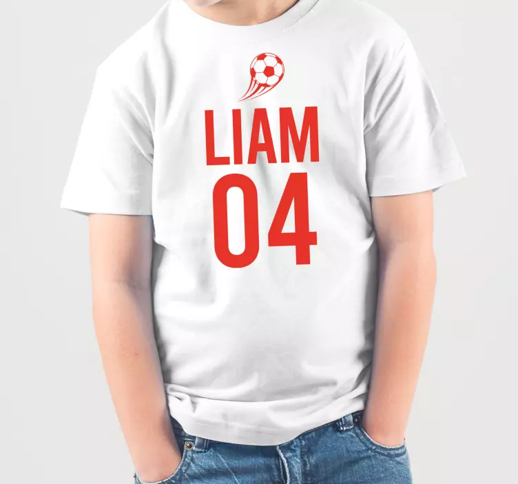 Referens: T4113Denna design har ett livligt fotbollstema, där namnet 'Liam' visas tillsammans med numret '04'. Färgerna är slående med djärva röda nyanser mot en vit bakgrund, perfekt för unga fotbollsälskare.
