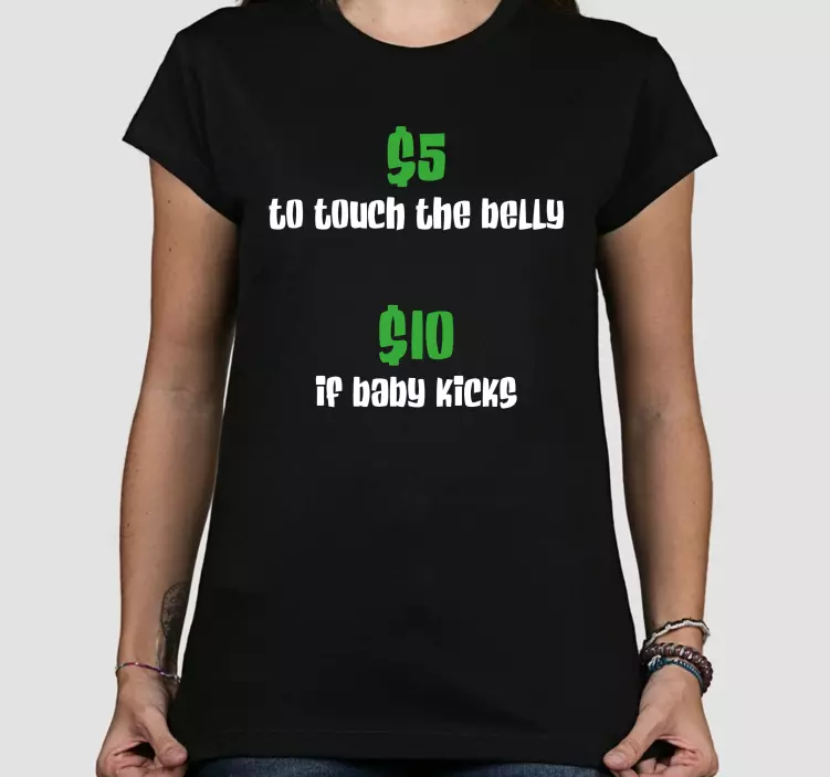 Referens: T5441Denna lekfulla design visar en humoristisk syn på graviditetsinteraktioner, med fet grön text på svart bakgrund. Den presenterar ett lättsamt förslag för att röra vid en baby bump med lekfull prissättning, vilket gör den perfekt för blivande föräldrar eller baby showers.