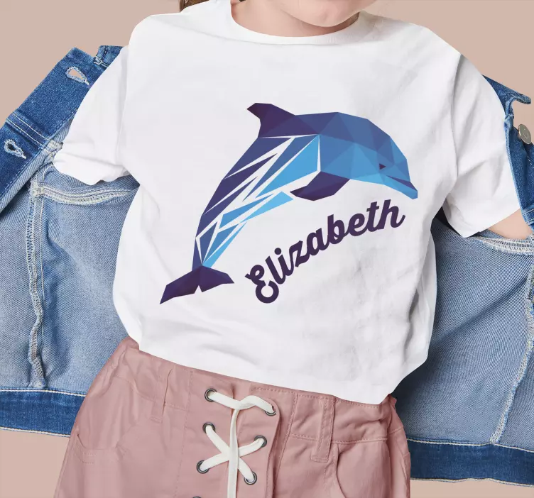 Referens: T4981Denna livfulla design har en stiliserad geometrisk delfin som symboliserar lekfullhet och glädje. Namnet centrerat nedanför ger en personlig touch, vilket gör den perfekt för små barn. De svala blå färgerna förstärker det livliga utseendet, vilket gör den lämplig för olika avslappnade tillfällen.