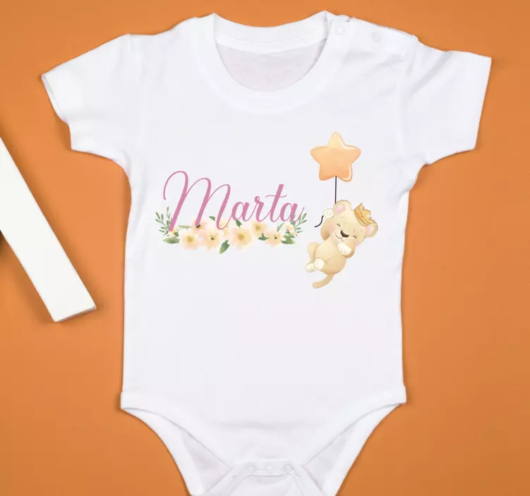 Referens: T5219Denna charmiga design har en söt björn som håller en stjärnballong, kompletterad med delikata blommor. Namnet 'Marta' är elegant integrerat i konstverket, vilket ger en glad och personlig touch som är perfekt för babykläder.