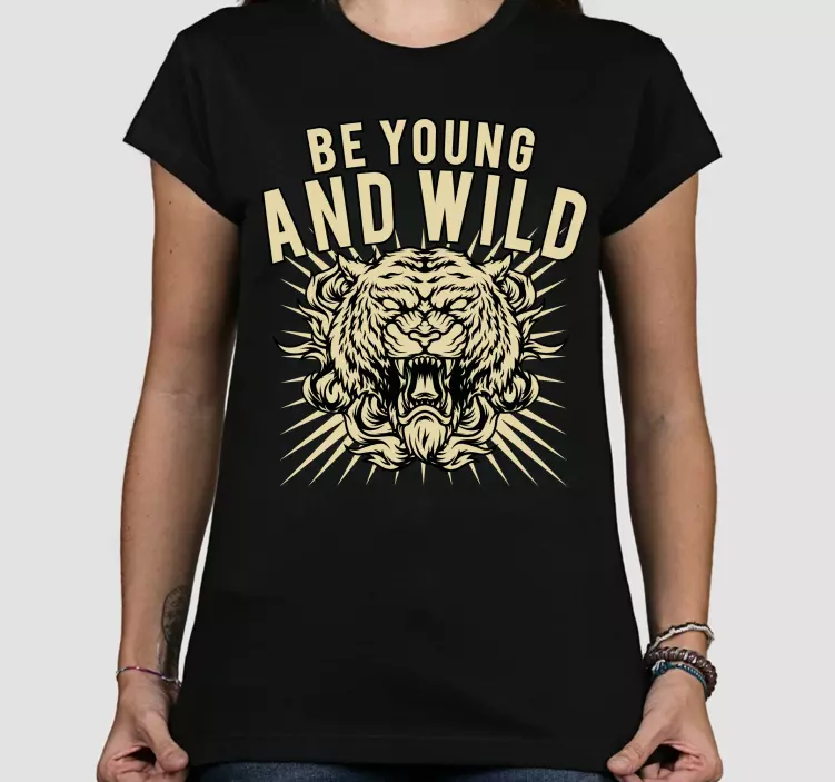 Denna design har ett kraftfullt lejonhuvud med djärv typografi som visar frasen 'Be Young and Wild'. Det vilda uttrycket hos lejonet förmedlar en känsla av styrka och äventyr, vilket gör det till ett slående val för individer som vill uttrycka sin vilda sida.