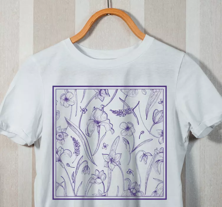 Upptäck den fantastiska Botanisk motiv arrangemang t-shirt med en unik och iögonfallande design! Med ett vackert mönster av krokus och andra blommor i lila nyanser, förenar denna blommiga t-shirt naturens skönhet med konstnärlig illustration. Den botaniska skissen på bakgrunden skapar en harmonisk känsla som gör att du alltid kommer att sticka ut i mängden!