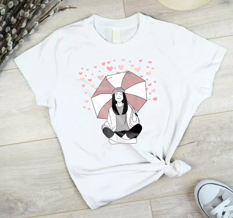 Upptäck vår Charming heart pattern t-shirt som fångar essensen av lekfullhet och kärlek! Med en söt illustration av en flicka som leker med ett paraply, omgiven av hjärtan och regn, sprider denna design glädje och charm. Den tecknade stilen kombinerar färg och kreativitet på ett sätt som gör att t-shirten verkligen sticker ut. En perfekt kombination av stil och komfort för den moderna kvinnan, denna t-shirt är både tillfällig och bekväm – idealisk för alla tillfällen!