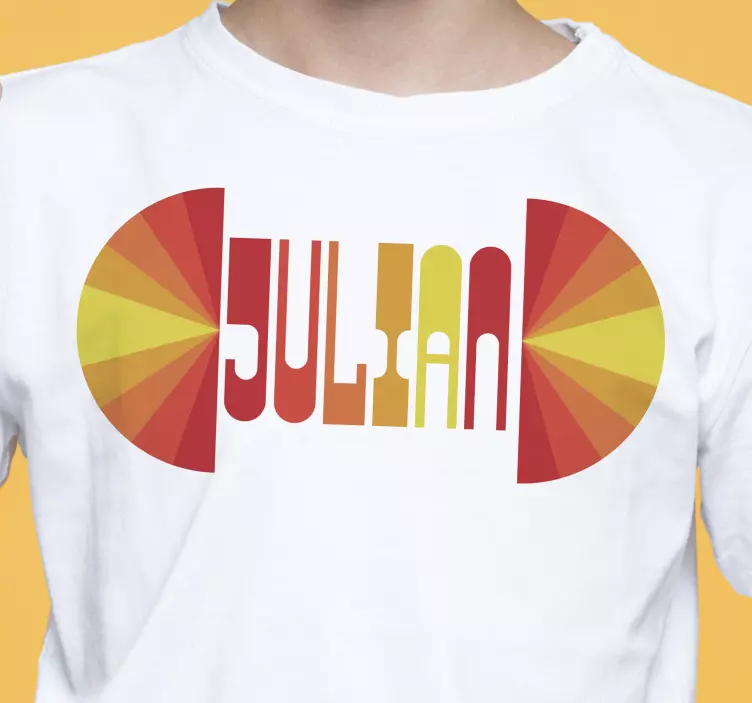 Referens: T4236Detta stiliga verk har en livlig namnvisning i fet typografi. Designen inkluderar varma färger som strålar i ett cirkulärt mönster, vilket skapar en iögonfallande fokuspunkt. Perfekt för att visa upp individualitet och en känsla för stil.