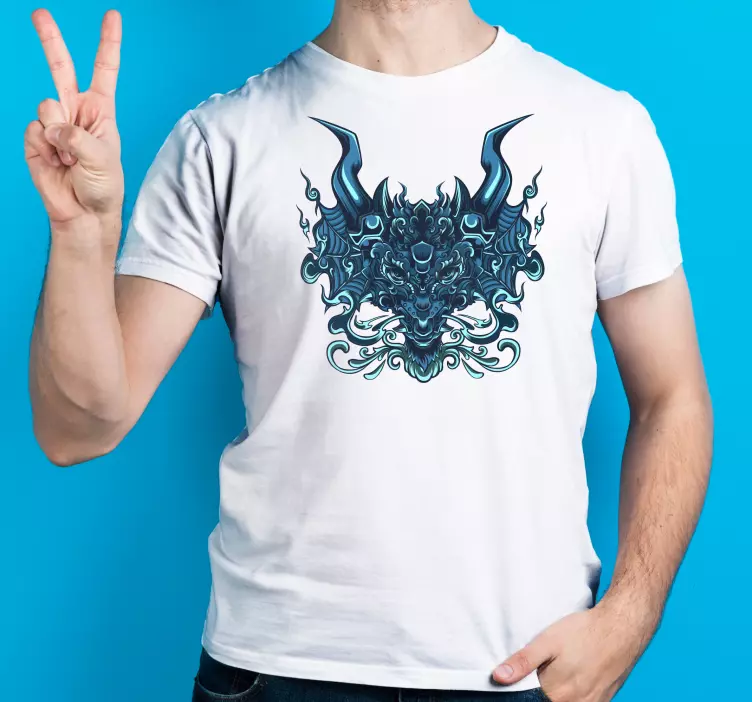 Referens: T4806Denna slående grafik visar en intrikat designad hornad varelse i djupa blå nyanser. Den detaljerade illustrationen visar en fusion av vilda element, vilket gör den idealisk för dem som söker ett unikt och kraftfullt utseende. Perfekt för att göra ett uttalande med sin dramatiska flair.