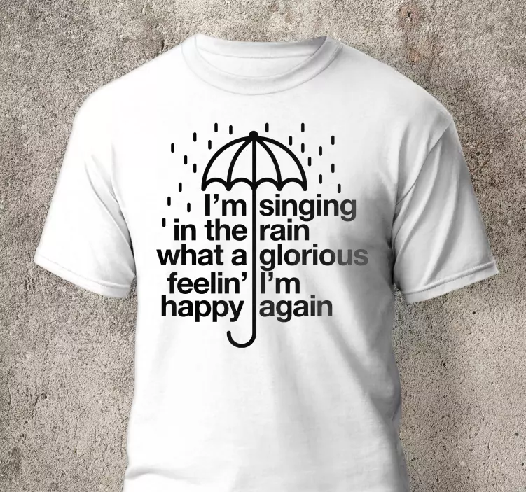 Referens: T4934Denna design har ett glatt paraply omgiven av regndroppar, kompletterat med upplyftande text. Den fångar en glad anda och uppmuntrar till positivitet även i dystert väder. Den stiliga typografin ger en lekfull känsla, vilket gör den perfekt för den som vill uttrycka sin kärlek till livet och musiken.