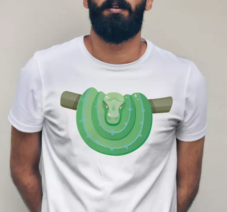 Upptäck vår fantastiska grön ormliknande design t-shirt som verkligen gör ett intryck! Denna snygga t-shirt har en unik grafisk design med en tecknad serieillustration av en orm som slingrar sig runt en gren. Den friska gröna färgen ger en känsla av liv och energi, vilket gör att du verkligen sticker ut i mängden. En perfekt kombination av stil och komfort, denna t-shirt är tillfällig och passar för alla tillfällen!
