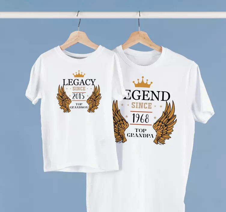 Designen har en krona med vingar och en respektive text: arv sedan... Topp sonson, legend sedan... Topp sonson. Den är anpassningsbar med det datum du väljer. Denna pjäs är den perfekta matchande skjortan för farfar och barnbarn som kommer att få dem att se snygga och enade ut.Varför denna produkt ska användas för kläder