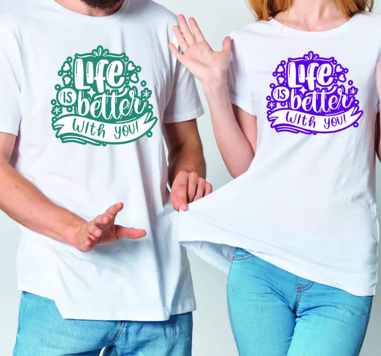 Referens: T4107Denna design lyfter fram ett glatt budskap som betonar glädjen av gemenskap. Visad på matchande kläder, skapar den livliga texten och dekorationerna en varm atmosfär, perfekt för att uttrycka kärlek och enhet. Idealisk för firande eller avslappnade utflykter, resonerar den med teman av koppling och lycka.