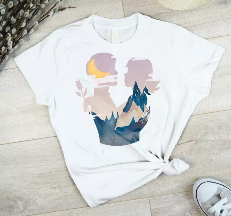 Denna Mors och dotter t-shirt silhuett av förbindelse är en fantastisk design som förenar kärlek och familjeband i en vacker illustration. Med en nipponesisk känsla, fångar den ömhet mellan mor och dotter genom en silhuett av två figurer under en måne, omgivna av majestätiska berg och naturliga element. Denna t-shirt är mer än bara kläder; den är en symbol för den speciella relationen mellan en mamma och hennes barn!