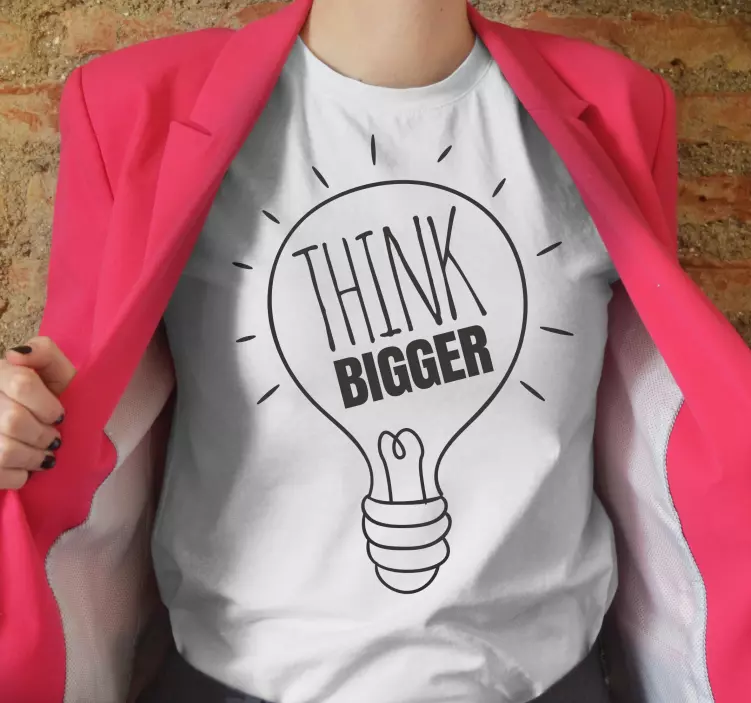 Referens: T4862Denna design visar en glödlampa med frasen 'Think Bigger' i fet stil. Bildspråket väcker en känsla av inspiration och positivt tänkande, med enkla men kraftfulla visuella element som resonerar med ett motiverande tema.