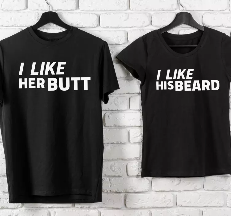 Vår Par t-shirt med humor för par är en festlig och rolig klädsel som fångar uppmärksamhet med sin unika design. Med en grafisk stil som inkluderar humoristiska inslag som tycka om, stånga, och skägg erbjuder denna t-shirt ett perfekt sätt att uttrycka kärlek och glädje som par. Den enfärgade svarta bakgrunden gör att de roliga texterna verkligen står ut och ger en lekfull ton till varje tillfälle. Oavsett humör kommer ni att känna er självsäkra och glada i denna design!