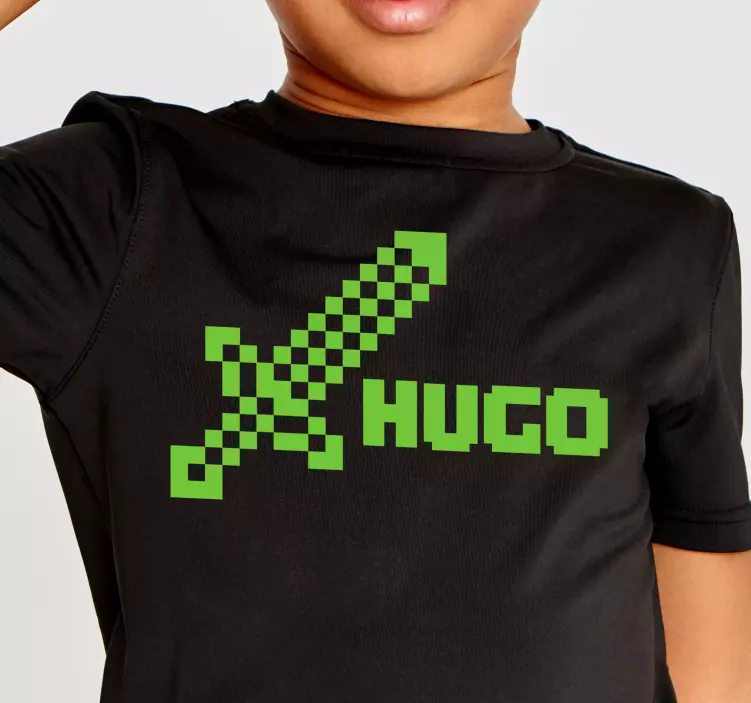 Referens: T4921Detta livfulla verk har en pixelerad svärdsdesign tillsammans med ett anpassningsbart namn. Den djärva gröna färgen mot en elegant svart bakgrund skapar en slående visuell attraktion, perfekt för unga spelentusiaster. Det är ett roligt, personligt tillskott till varje barns garderob.