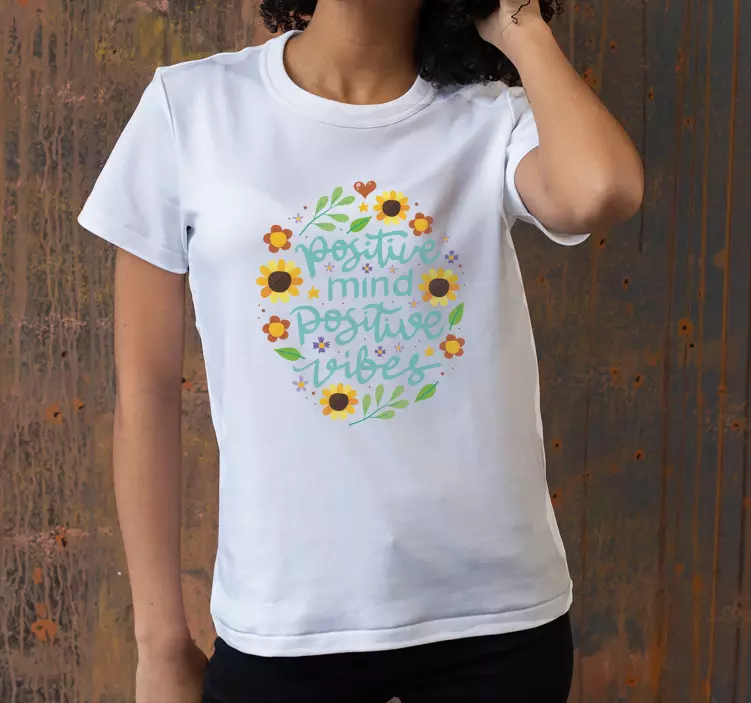 Upptäck vår fantastiska Positive mind vibes t-shirt, där varje detalj är noggrant utformad för att sprida glädje och positiv energi! Designen pryds av solrosor och blommor som symboliserar livets skönhet, tillsammans med ett hjärta som uttrycker kärlek och omtanke. Med ett budskap som fokuserar på ett positivt sinne och mindfulness kommer denna t-shirt att motivera dig och ge dig vibrafon av glädje varje gång du bär den. Sätt på dig denna t-shirt och känn hur naturens skönhet och motivering omger dig!