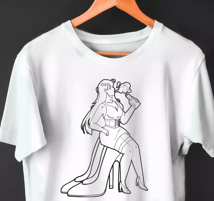Den Stylish high heel vibe t-shirt är en fantastisk kombination av mode och konst, där en vacker handritad silhuett av en kvinna med höga klackar framhäver elegansen hos en modern kvinna. Den grafiska designen fångar essensen av cocktail och rökning, med en stilfull skiss som ger en känsla av lyx och självsäkerhet. Med illustrationer av vape och mode, är denna t-shirt ett perfekt val för den stilmedvetna.