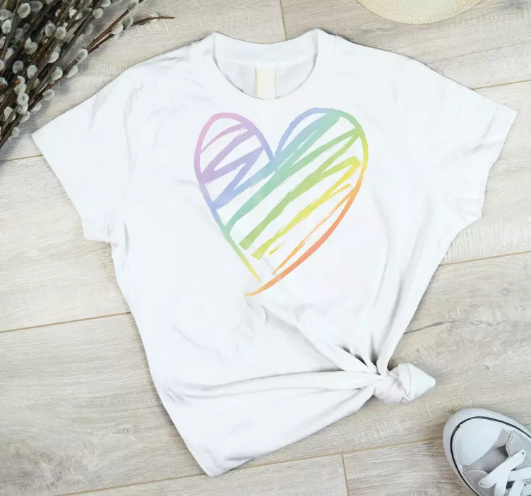 Upptäck vår fantastiska T-shirt med flerfärgad hjärtdesign som verkligen fångar ögat! Denna t-shirt är dekorerad med en regnbåge som elegant omger ett hjärta, vilket skapar en livlig och färgrik klotterdesign. Med sin unika lutning och snygga finish ger den en tillfällig känsla som gör att du alltid ser fantastisk ut. Bär denna T-shirt med flerfärgad hjärtdesign och låt din personlighet skina!