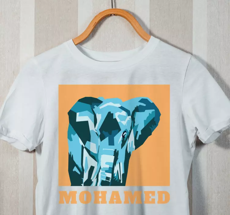 Referens: T4979Denna design visar ett slående elefantporträtt skapat i livliga geometriska former. Färgpaletten innehåller olika nyanser av blått som kompletteras av en orange bakgrund, vilket gör det till ett fängslande verk. Namnet 'Mohamed' är tydligt framhävt, vilket ger en personlig känsla.