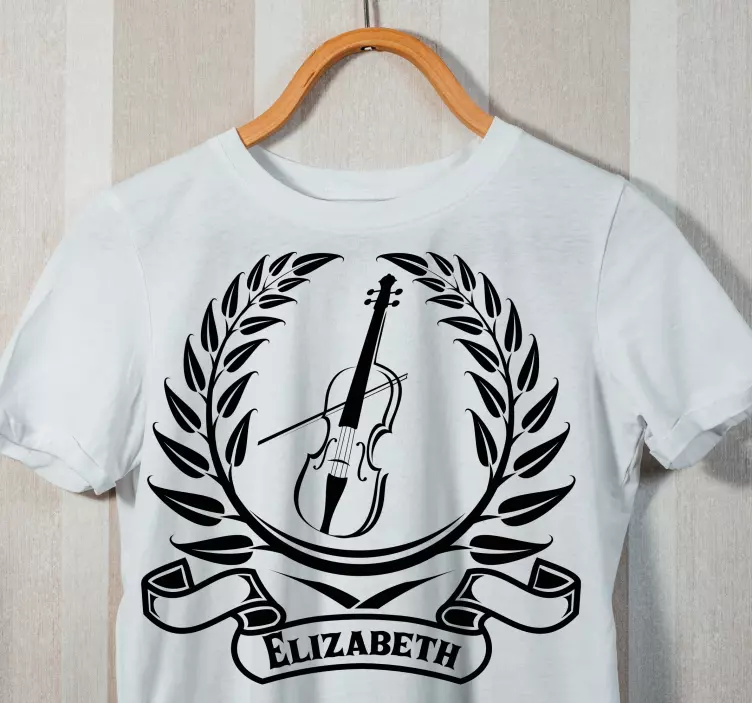 Referens: T4492Denna unika design har en violin i centrum, omgiven av en lagerkrans. Namnet 'Elizabeth' presenteras elegant på ett band under emblemet, vilket ger en personlig touch. Den monokromatiska färgskalan betonar tematets klassiska och raffinerade karaktär.