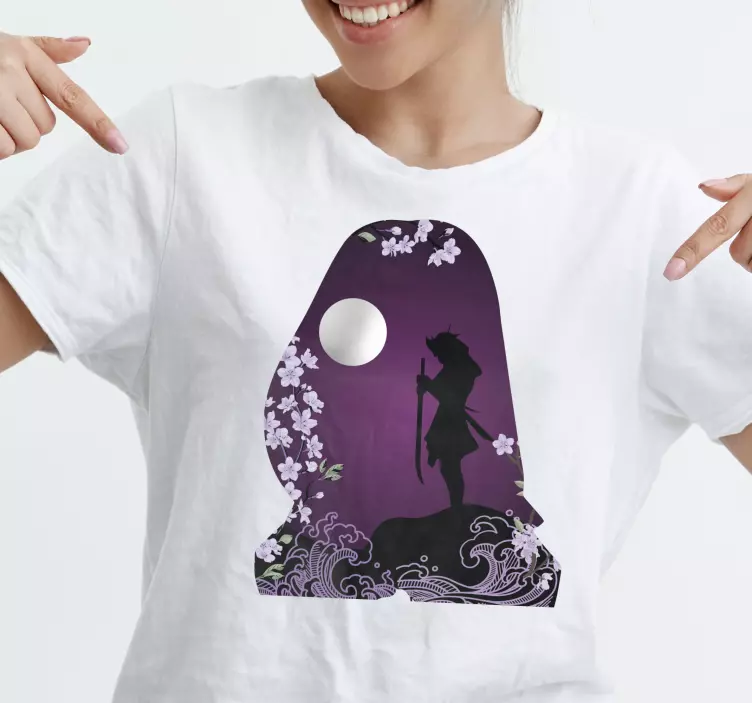 Referens: T4771Detta stiliga verk har en silhuett av en krigare bland körsbärsblommor och en måne på en livlig lila bakgrund. De blomsterliknande elementen ger en touch av elegans, vilket gör den perfekt för uttrycksfulla individer som uppskattar konstnärlighet i sin garderob.