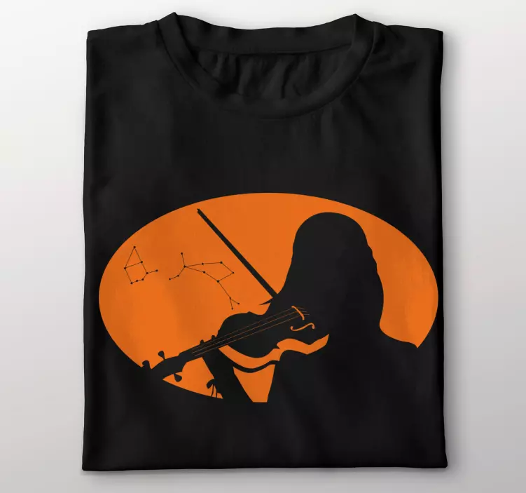 Upplev magin av musik med vår fantastiska T-shirt violinist under stjärnorna! Denna unika design fångar essensen av en violinist i en vacker silhuett mot en stjärnklar himmel. Med en illustration av en musiker som spelar sin fiol, omgiven av glittrande konstellationer i en förtrollande orange och svart färgpalett, är denna t-shirt en hyllning till den klassiska musiken och dess underbara värld!