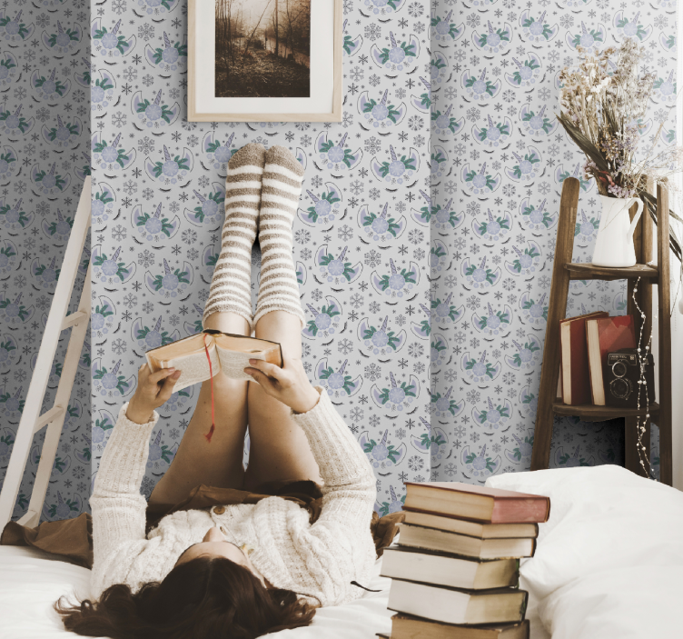 Upplev en harmonisk atmosfär med vår Tapet blommig mysig blommig reträtt! Denna fantastiska design fångar ögat med sina drömlika mönster av enhörningar och snöflingor, omgiven av blommor som ger en känsla av avslappning och mysighet. Perfekt för att skapa en dekorativ och inspirerande miljö, där du kan njuta av dina böcker och koppla av i ditt hem.